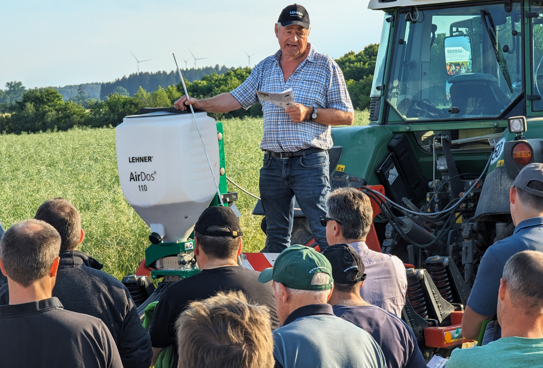 Hier wurde zu Beginn das neue pneumatische 12V-Streugerät AirDos® für Zwischenfrüchte vorgestellt und live vorgeführt. Hier wurde besonders deutlich wie gleichmäßig die Querverteilung gewährleistet werden kann.